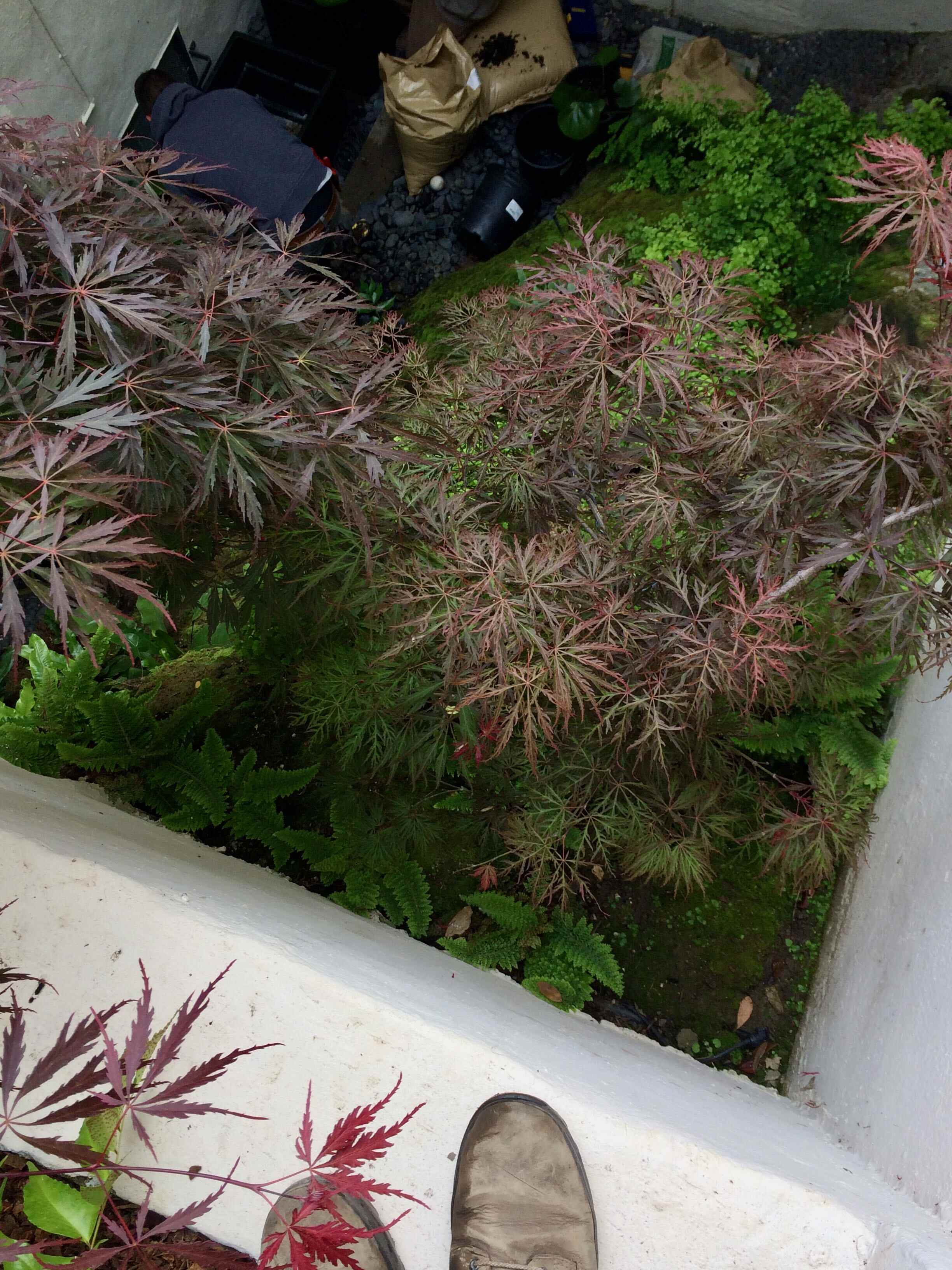 Extreme gardening in this small notch garden in San Francisco. The project is tucked in the middle of a classic art deco building on a steep hill overlooking Alcatraz and the San Francisco Bay. Access involves climbing a 70 step concrete staircase and a four rung ladder. We have to duck under a 48” tall opening, squeeze through a 12” wide slot and finally descend another 12 rung custom made ladder into the workspace. Every plant, every person and every tool has to enter by this route. The garden is carved into a soft, crumbling cliff face, so the plants cling to stay in place. It never sees the sun. We introduced misters and created a ferny grotto. Our kind clients tell us this tiny space, which they view from several windows gives them the greatest pleasure.